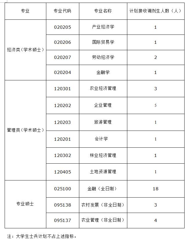 2018年,我院经济类专业(包括产业经济学、国际贸易、劳动经济学和金融学),管理类专业(包括企业管理、旅游管理、会计学、农业经济管理、林业经济管理、土地资源管理)和专业类学位(金融全日制、农业管理和农村发展非全日制)硕士点有部分调剂名额(具体名额见附表)。上述所有专业同时接收退役大学生士兵计划调剂生。