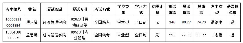 学校根据上级部门政策和各学院招生情况,增加我院2018年硕士研究生农业管理招生指标1个,现从yl6809永利官网2018年统考硕士复试候补名单中,拟录取1名全日制农业管理专业硕士。另有1名已公示拟录取全日制学术硕士(考生姓名:袁),因其放弃拟录取资格,现拟补录取1名全日制学术型硕士。拟录取考生信息如下: