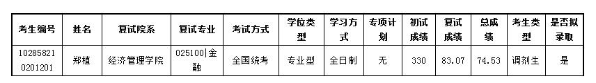 现1名已公示拟录取全日制金融专业硕士(考生姓名:于文渊),因个人原因放弃拟录取资格。经学院招生工作领导小组研究决定:现从候补名单中拟补录取1名全日制金融专业硕士。拟录取考生信息如下: