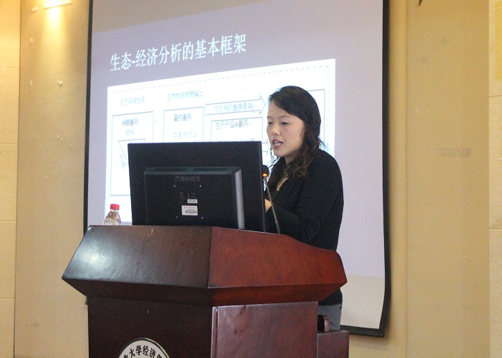 紧接着,赵教授从生态服务价值评估的定义和案例分析两方面为大家解释了生态服务是如何进行价值评估的。她指出,生态服务是为人类所受益的,生态服务的价值评估被定义为量化由自然系统提供给人类福祉或价值。生态服务评估经常面临来自概念界定模糊与实践操作上两方面的挑战。目前关于生态服务的文献,以一般性框架和视角为主。许多实证应用由于采用了不完善的方法,误导了公众和私人决策。由此,赵教授对“如何才能推动更为有效、精确和具有参考价值的生态服务估计值”这个问题从“评估什么服务”、“如何进行评估”、“在什么范围与规模内估计”三个方面展开了精彩的解答。