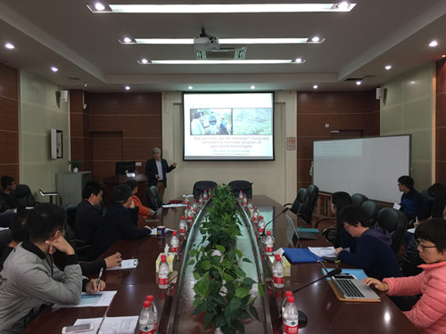 聘任仪式过后,JeffreyAlwang教授深入浅出,介绍了北厄瓜多尔马铃薯农民的随机对照试验(RCT),并展示关于收到短信提醒对农民知识和综合病虫害管理(IPM)实践的影响,从而探讨信息和通信技术在促进农业实践变化中的具体作用。随后,他还对信息沟通技术的应用前景作出评价,并总结研究中存在的突破和不足。最后,JeffreyAlwang教授补充介绍了随机对照实验在农业投入、保险和金融等研究领域的应用,并建议各领域应更广泛地使用该种研究技术。