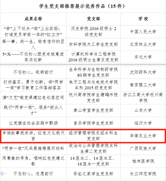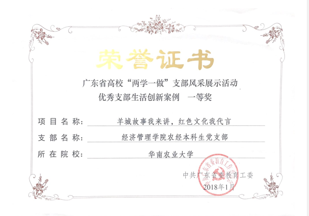 近日,我院农经本科生党支部的作品《羊城故事我来讲,红色文化我代言》参与第二届全国高校“两学一做”支部风采展示活动,并入选“学生党支部推荐展示优秀作品”遴选名单。