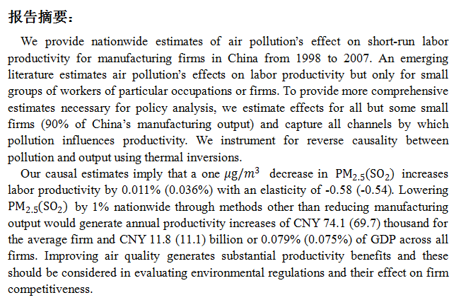 报告题目:Air Pollution and Manufacturing Firm Productivity:Nationwide Estimates for China