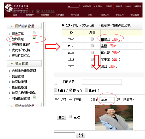 3、 各栏目由学院各部门负责管理,具体管理权限已发放给对应负责人;所有文章均需各自分管领导审核,用户本人发布文章后是无法直接公开的,需将分管领导审核证明发给院网管理员林琪珊(电话/微信18813751169),由管理员审核后方可公开。