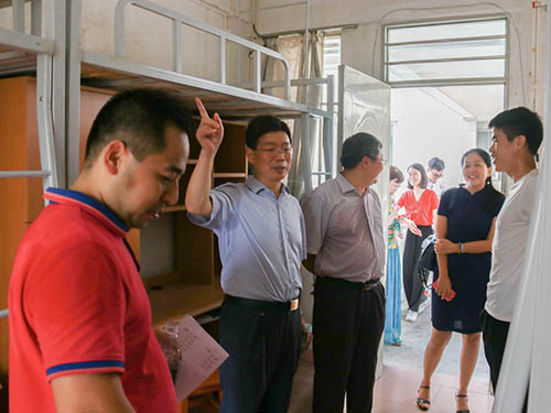 图1:院党委书记王长明、院长万俊毅携一众辅导员走访新生宿舍