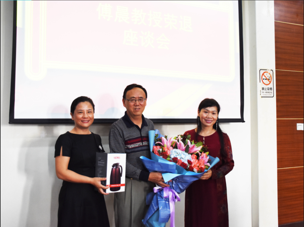 我院副院长王丽萍为傅晨教授献上鲜花,感谢傅教授对经管学院所做的贡献,工会主席齐文娥在掌声中为傅教授送上退休纪念品。