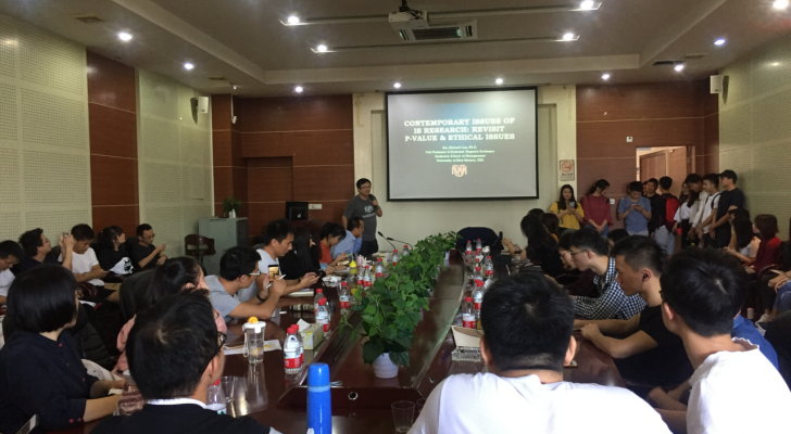 罗欣教授阐述了当代IS(信息系统)研究中很重要的议题:重建P值和道德问题。P值是实证研究中使用最广泛的检验统计值,是假设检验显著与否的重要指标,但不幸的是,这也经常导致P值得普遍性滥用,通过Hacking的手段提高P值以获得理想的统计结果,却违背了学术道德,制造没有意义的伪科学,这也引起各国学者的关注。罗欣教授介绍了常见的几种P值的Hacking,包括捕获和分析许多不同的度量并只报告p <0.05的部分;收集和分析多种条件;收集并使用许多协变量将p值降至<0.05;只选择偏爱的参与者;调整数据。尔后,罗欣教授分享了几种可能的解决方法,第一种技术手段包括报告如何确定有效样本;报告样本的效力分析,报告所有的测量;报告所有的操作条件;报告除外部分;报告没有协同变量的情况。第二种方法则强调披露并减少选择性的报告,使意图和分析变得透明,具体可以对探索性假设检验进行预注册(已有的国际网站:https://osf.io/prereg)。最后,罗欣教授为师生们的学术研究的关注点提出了几点建议,以更好促进学术进步。罗欣教授的讲座让老师和同学们更多地了解国际学术关注的前沿议题。同学们参与讲座的热情高涨,座无虚席,并积极参与互动。罗欣老师也耐心回答了老师和同学们关心的问题,这次讲座为yl6809永利官网师生争取在国际期刊上发表更多论文提供了有益启发。