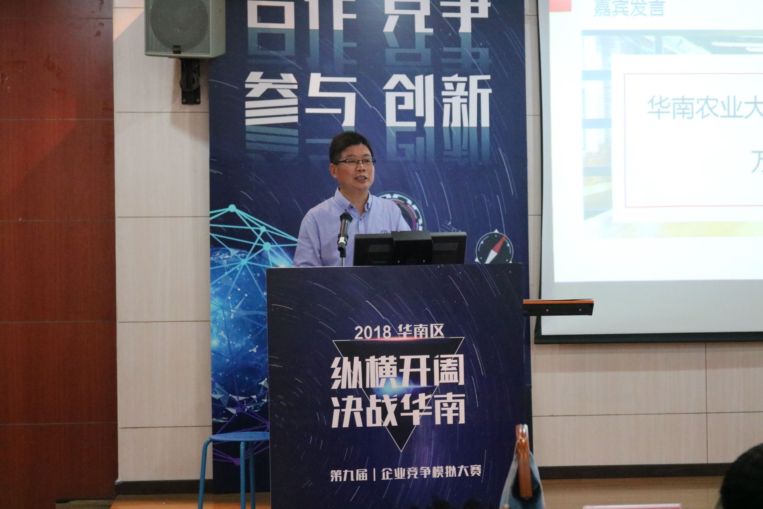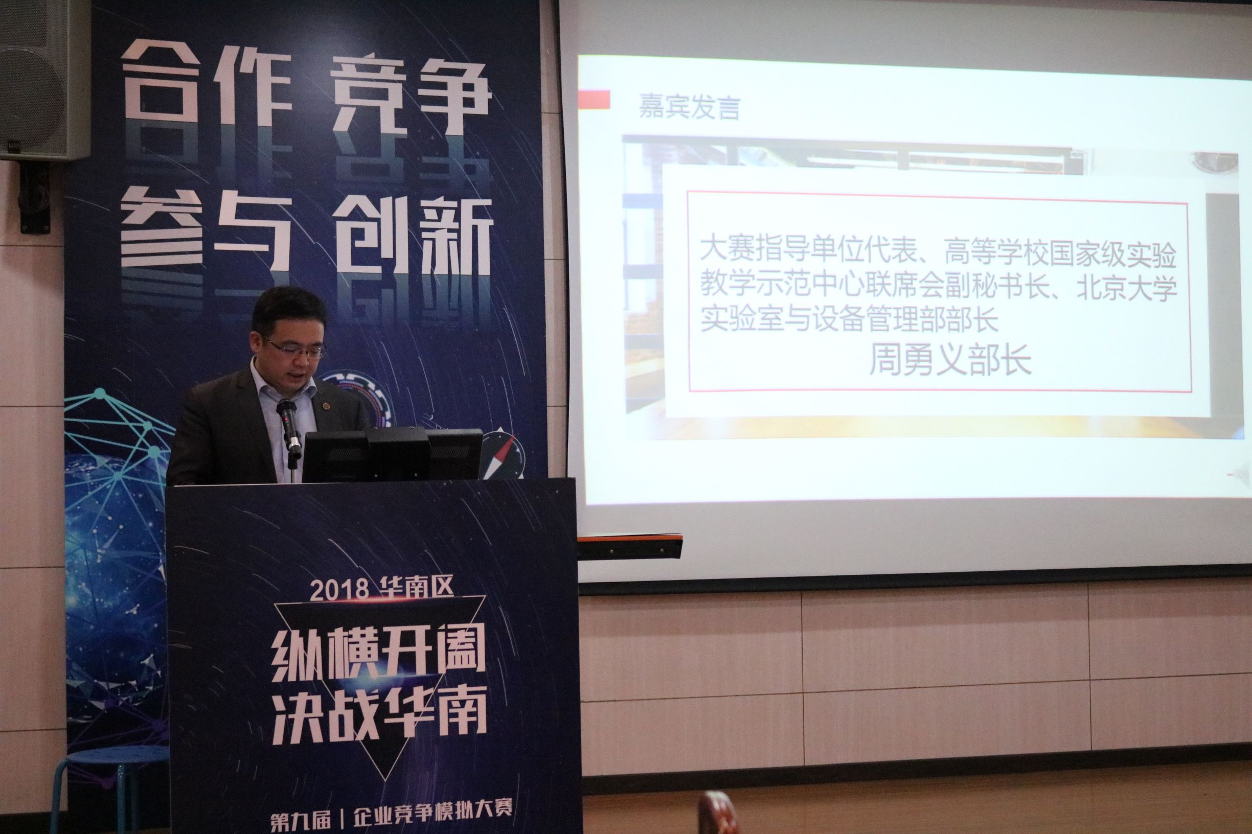 接着,大赛指导单位代表、北京大学实验室与设备管理部周勇义副部长对本次大赛进行总结发言。他指出,华南区高等院校企业竞争模拟大赛,是在“全面落实国家教育方针,进一步加强创新创业教育”的这一背景下发展而来的。最近五年来,华南区企模赛事规模不断扩大,影响力日增,本次大赛参赛规模达28所高校227支参赛队伍近680名参赛选手,新增参赛院校11所,参赛院校数量及新增参赛院校数量创历史新高。在赛制上,本届华南区大区赛首次与广东省赛紧密结合,这是勇于创新与改革的行动。华农人的汗水与努力为大家呈现了一场精彩绝伦的赛事!