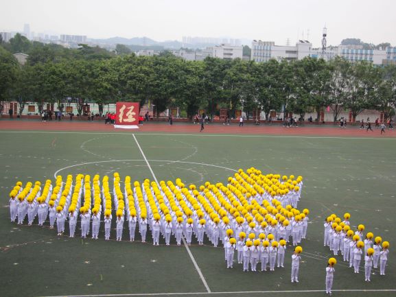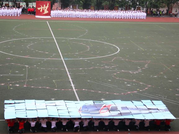 450人跑动成中国地图,首先呈现人浪的效果,接着地图从西部开始变黄,寓意祖国发展不忘西部,往后西部将是红色一片的繁荣,与祖国共同步入新纪元。
