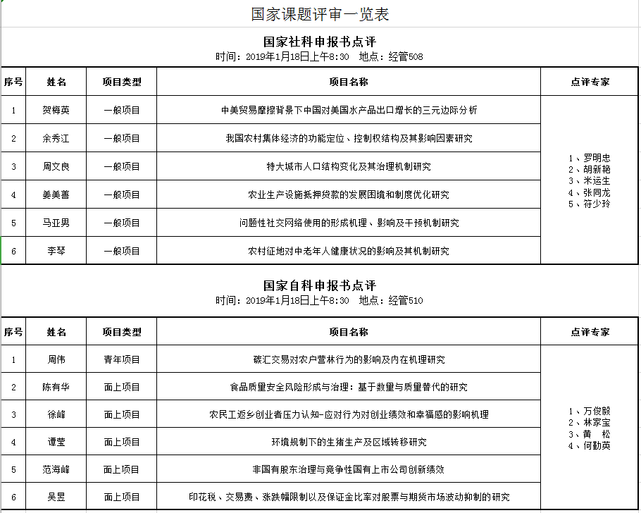 为进一步推进我院国家课题申报工作,2019118日上午,我院在经管学院508510会议室顺利举行国家自然科学基金、国家社会科学基金申报书点评会。本次点评会邀请了校内有丰富申报经验的9名专家参加,分别是yl6809永利官网国家农业制度与发展研究院胡新艳教授、米运生教授、张同龙教授,以及我院万俊毅教教授、罗明忠教授、林家宝教授、何勤英教授、符少玲教授、黄松教授,为我院已完成申报书初稿的12名教师进行面对面的辅导。