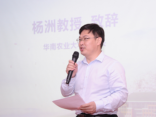 杨洲副校长致辞,他表明,本次比赛体现了“锐意创新,科学创业”的初衷,不仅有利于提升我校本科教学水平,也有益于加强与兄弟单位和企业的合作。感谢教育厅给予华农承办本次比赛的机会。同时,杨洲对华农建校110周年取得的辉煌成果进行了简要介绍。