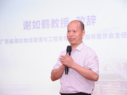 教育部高校物流类专业教学指导委员会委员、广东省物流教指委主任谢如鹤教授致辞,他回顾了本次比赛的全过程,全省一共有32所高校86支队伍参加校内选拔,进入初赛、复赛,最终13所高校20支队伍进入决赛。他高度评价了本次大赛的组织,在公平公正的环境下展示了比赛的水平和青年物流学子的风采。