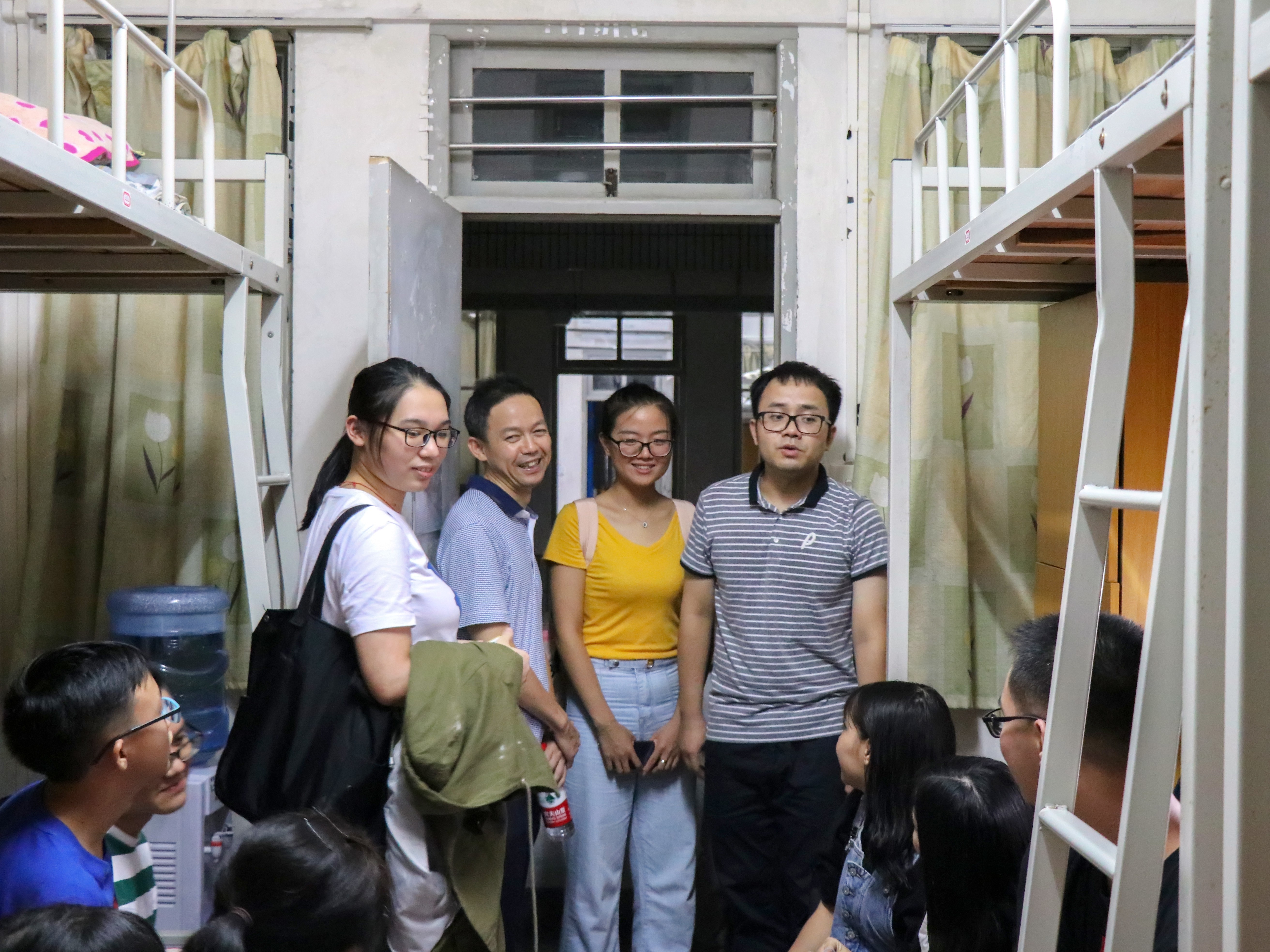 为更深入了解新生入学情况和需求,帮助新生尽快适应大学生活,8月26日晚,我院党委书记蔡传钦、院长米运生与学院全体辅导员们走访了2019级本科生新生宿舍,与新生们亲切交谈。