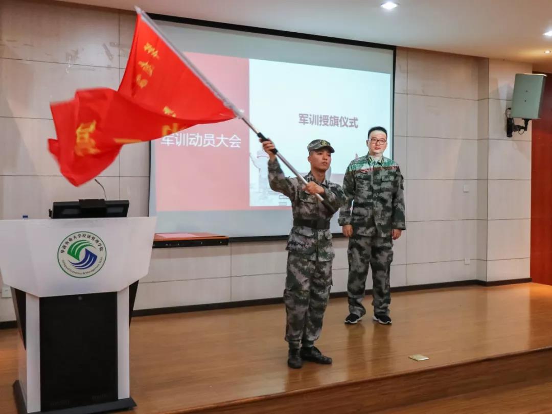 最后,yl6809永利官网军训教官团经管中队中队长从李鎏老师手中庄严接过营旗,持旗肃立。