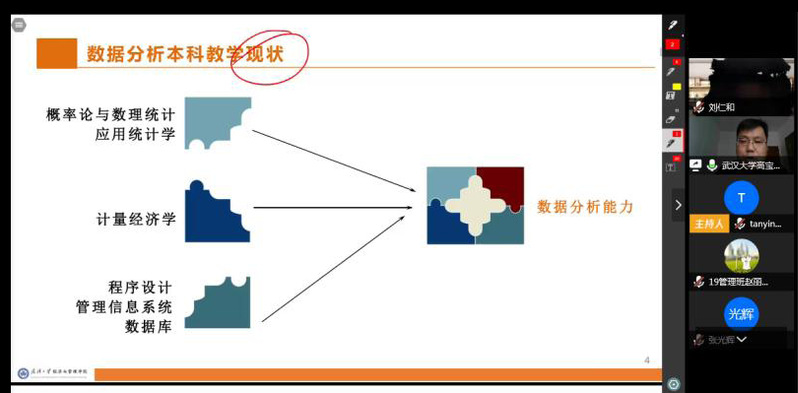 本次报告的主题是“实验趋动的经管类学生数据分析能力的提升改革”。高教授首先从数据分析人员的背景、数据分析流程、数据分析人员培养解决方案、现有三种数据分析体系架构以及数据工具与平台选拔等介绍了经管类数据分析人才培养现状和数据工具的运用;然后重点讲述了武汉大学经管学院目前开设的课程——《R语言数据分析方法与实验》的教学目标、教学组织和教学方法。高教授主要从夯实技能、提升理论、工业应用、教研结合、学术前沿和拔尖人才等方面做了详细阐述该课程的教学目标,该课程的教学组织与方法主要通过采用实验驱动、项目导向、团队建设等教学方法组织和实施课堂教授。最后,高教授通过案例分析,介绍课程取得的成绩,由于教学目标明确,教学内容前沿,教学组织和方法科学,学生学过课程后,数据分析能力和处理能力大幅提升,优秀学生能够发表高档次的论文,一部分学生能够拿到一流大学的研究生入学的OFFER。报告结束后,高教授愉快地与专业主任和部分教师进行了互动,互动内容包括:数据分析相关课程如何开设、数据分析前置课程如何设置、数据人才如何培养、学生学习兴趣如何激发、经管类人才培养方案课程优化等方面进行了深入交流与沟通。