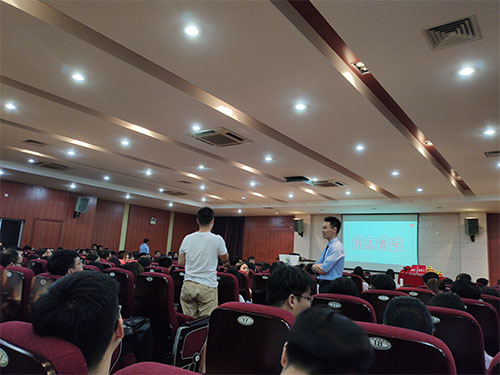 经理发言完,宣讲会还设置了提问环节,通过问答的方式与同学们进行互动。在主讲人介绍环节结束后,是答疑环节。听完主讲人的介绍后,同学们对海天味业有了更加深厚的兴趣,纷纷举手提出自己的问题,主讲人一一耐心地回答同学们的问题。