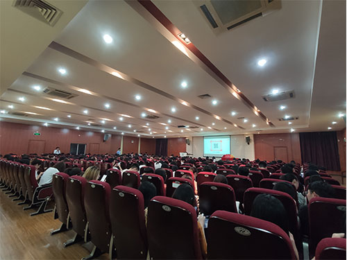 宣讲会开始,先播放一段海天味业的宣传视频,详细地介绍了海天味业的产业链及员工的待遇。接着是主持人的介绍环节,主持人介绍了此次宣讲会的流程,并请出海天味业的经理来介绍企业。刘经理结合自身在华农的经验,谈自己对海天集团的理解以及自己在海天味业的收获。