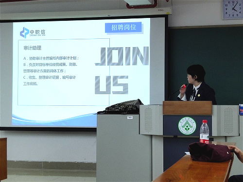 此外,由校友师姐给同学们分享她的求职和工作经历,并谈及了中职信有较好的资源可供员工学习。然后,中职信另一位员工上台介绍了企业所需招聘的岗位和参与应聘的方式,还着重说明了应聘者需知的注意事项。