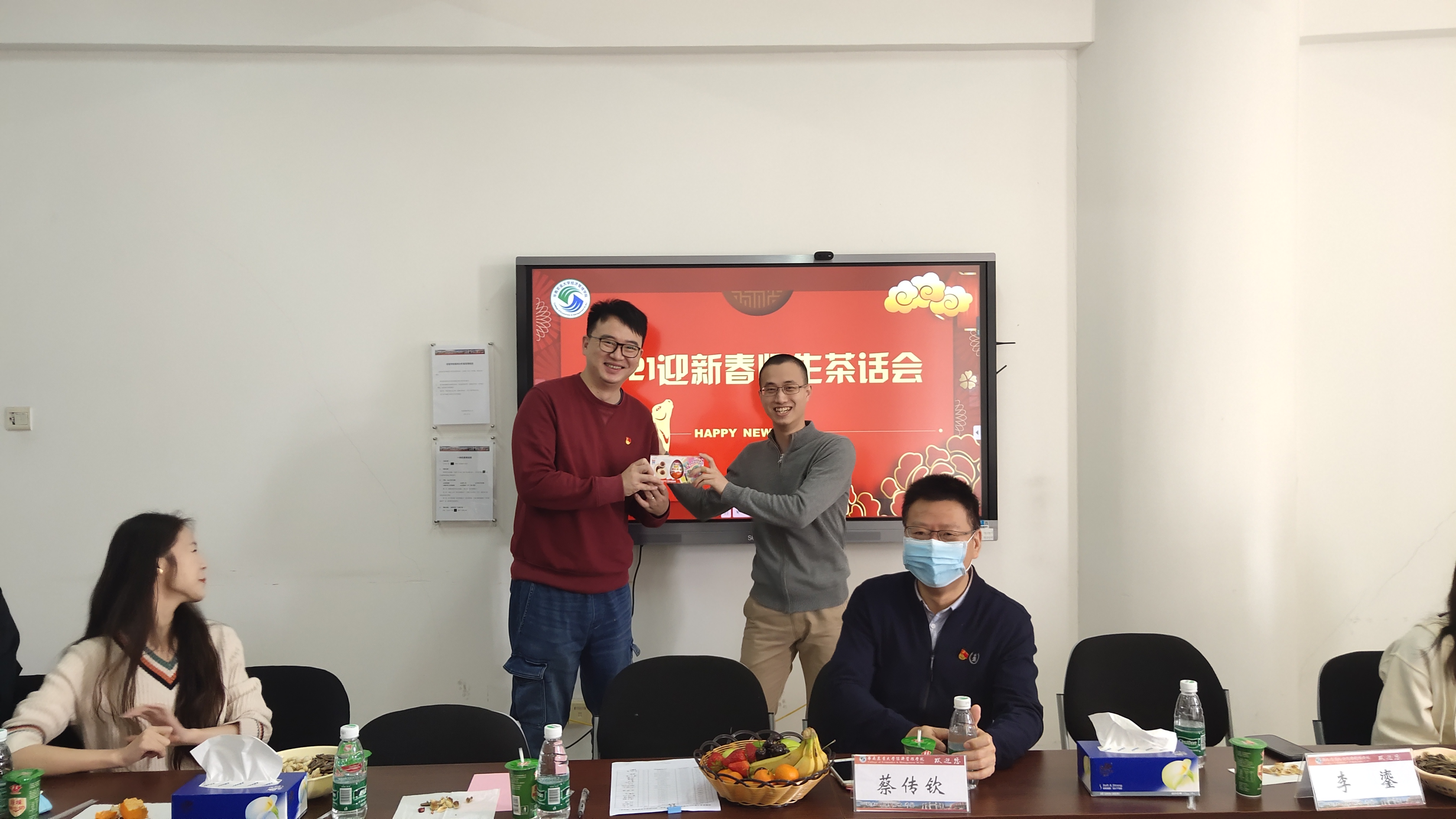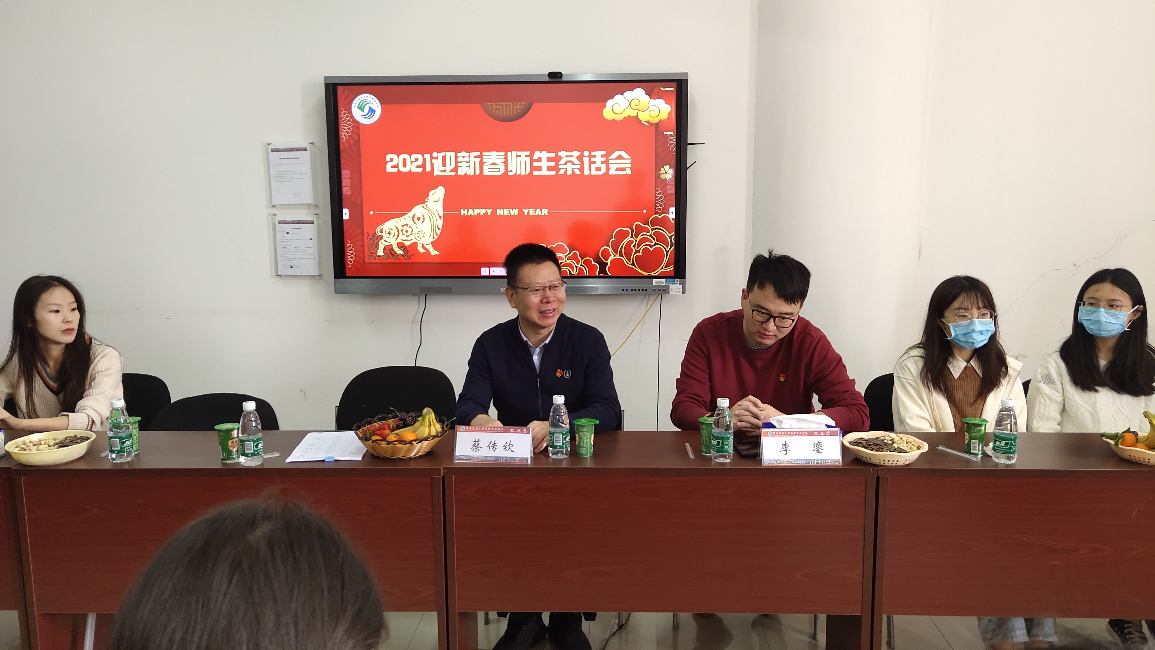 牛年新年来临之际,在学院社区,一场迎春师生茶话会生动开场,学院领导和22位留校过寒假的同学共聚一堂,闲话家常,畅叙师生情谊。学院党委书记蔡传钦、党委副书记李鎏、辅导员綦林老师、留校研究生及本科生应邀参加茶话会。