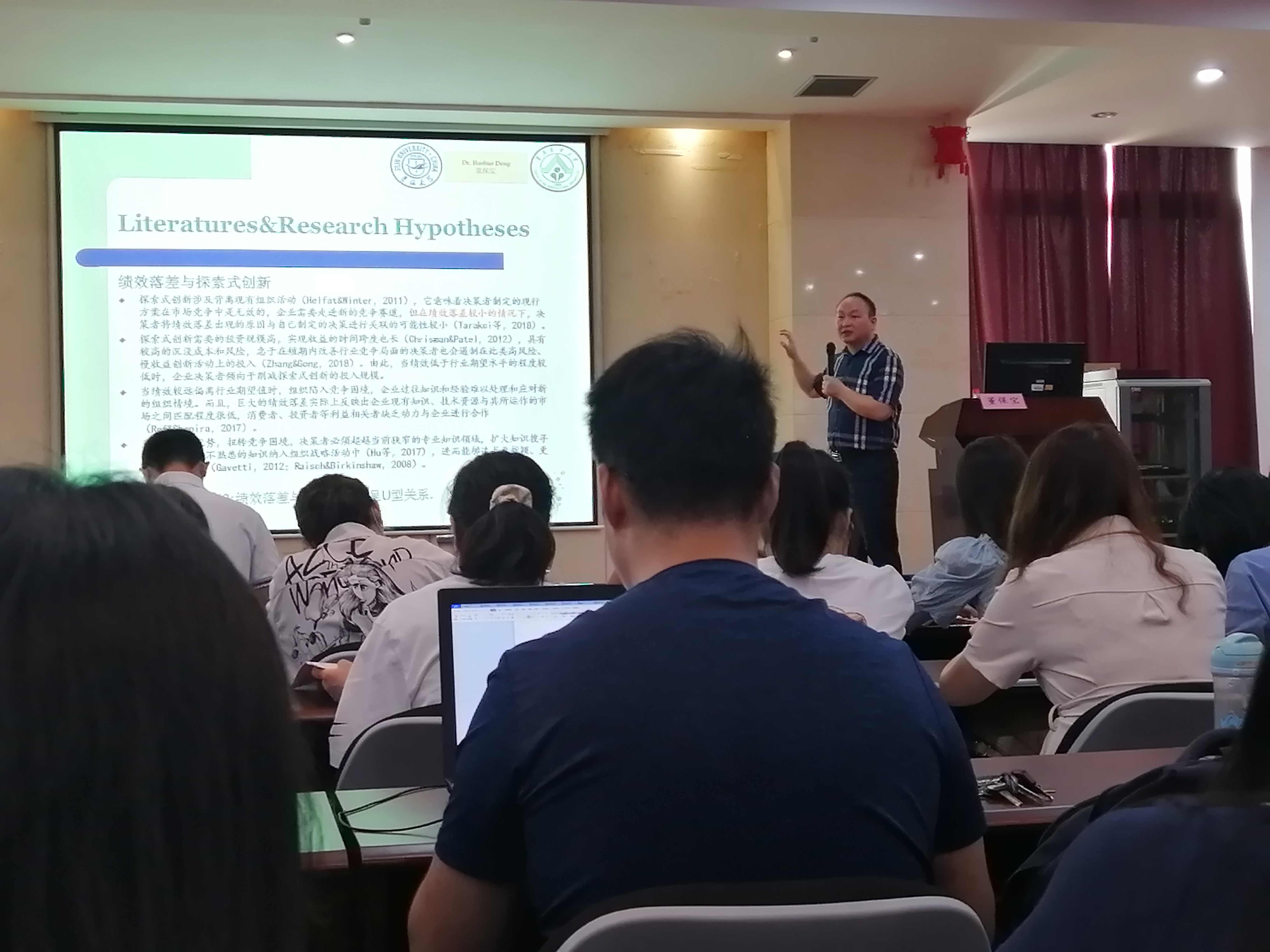 2021年5月12日上午,吉林大学管理学院教授、博士生导师董保宝博士应邀来访我校,在我院601会议室为师生们作了题为“究竟是探索还是利用?绩效落差下的双元创新战略研究”的学术讲座。会议由我院农商管理系系主任杨学儒教授主持。