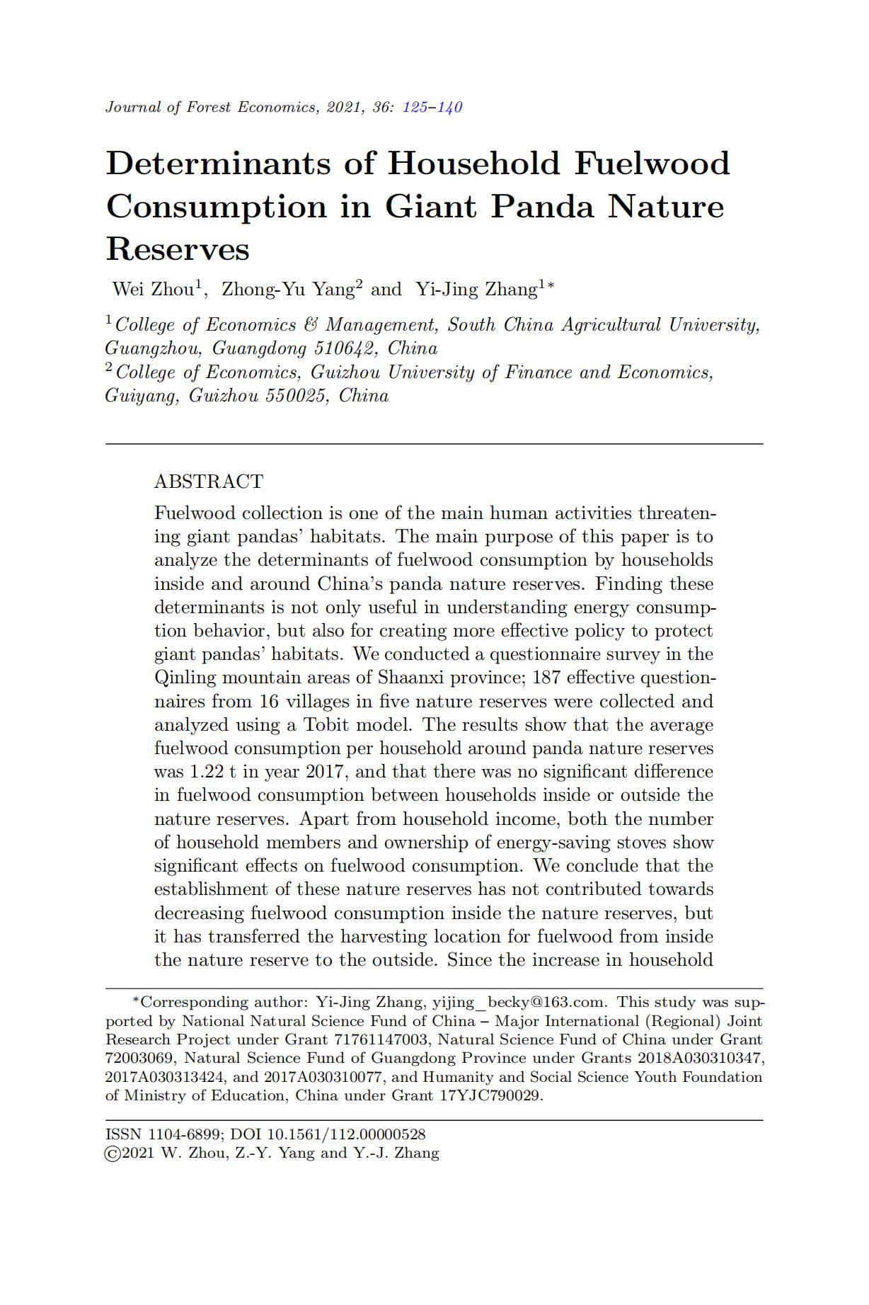 Fuelwood collection is one of the main human activities threatening giant pandas’ habitats. The main purpose of this paper is to analyze the determinants of fuelwood consumption by households inside and around China’s panda nature reserves. Finding these determinants is not only useful in understanding energy consumption behavior, but also for creating more effective policy to protect giant pandas’ habitats. We conducted a questionnaire survey in the Qinling mountain areas of Shaanxi province; 187 effective questionnaires from 16 villages in five nature reserves were collected and analyzed using a Tobit model. The results show that the average fuelwood consumption per household around panda nature reserves was 1.22 t in year 2017, and that there was no significant difference in fuelwood consumption between households inside or outside the nature reserves. Apart from household income, both the number of household members and ownership of energy-saving stoves show significant effects on fuelwood consumption. We conclude that the establishment of these nature reserves has not contributed towards decreasing fuelwood consumption inside the nature reserves, but it has transferred the harvesting location for fuelwood from inside the nature reserve to the outside. Since the increase in household income can significantly reduce the fuelwood consumption, policymakers should focus on how to increase rural household incomes to decrease fuelwood consumption. However, providing rural households around nature reserves with energy-saving stoves tends not to be an effective measure for reducing the fuelwood consumption.