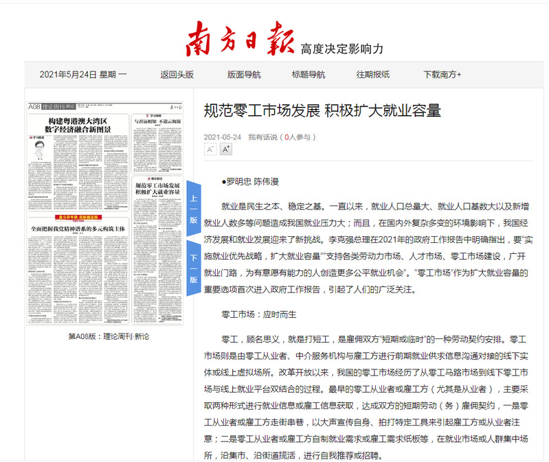 就业是民生之本、稳定之基。一直以来,就业人口总量大、就业人口基数大以及新增就业人数多等问题造成我国就业压力大;而且,在国内外复杂多变的环境影响下,我国经济发展和就业发展迎来了新挑战。李克强总理在2021年的政府工作报告中明确指出,要“实施就业优先战略,扩大就业容量”“支持各类劳动力市场、人才市场、零工市场建设,广开就业门路,为有意愿有能力的人创造更多公平就业机会”。“零工市场”作为扩大就业容量的重要选项首次进入政府工作报告,引起了人们的广泛关注。