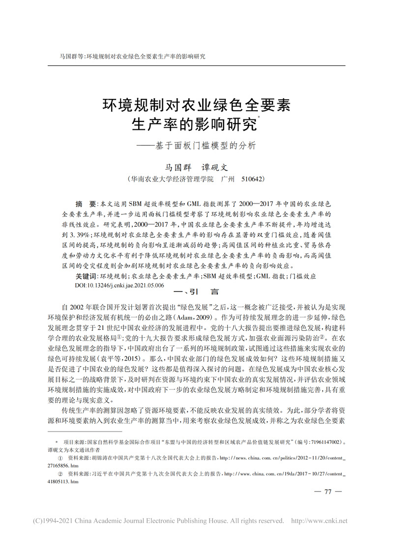 本文运用SBM超效率模型和GML指数测算了2000—2017年中国的农业绿色全要素生产率,并进一步运用面板门槛模型考察了环境规制影响农业绿色全要素生产率的非线性效应。研究表明,2000—2017年,中国农业绿色全要素生产率不断提升,年均增速达到3.39%;环境规制对农业绿色全要素生产率的影响存在显著的双重门槛效应,随着阈值区间的提高,环境规制的负向影响呈逐渐减弱的趋势;高阈值区间的种植业比重、贸易依存度和劳动力文化水平有利于降低环境规制对农业绿色全要素生产率的负面影响,而高阈值区间的受灾程度则会加剧环境规制对农业绿色全要素生产率的负向影响效应。
