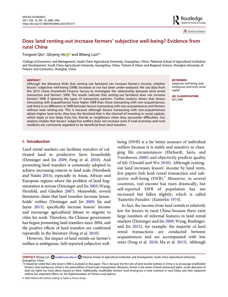 Subjective well-being; Land renting-out; Land rents; Social capital
