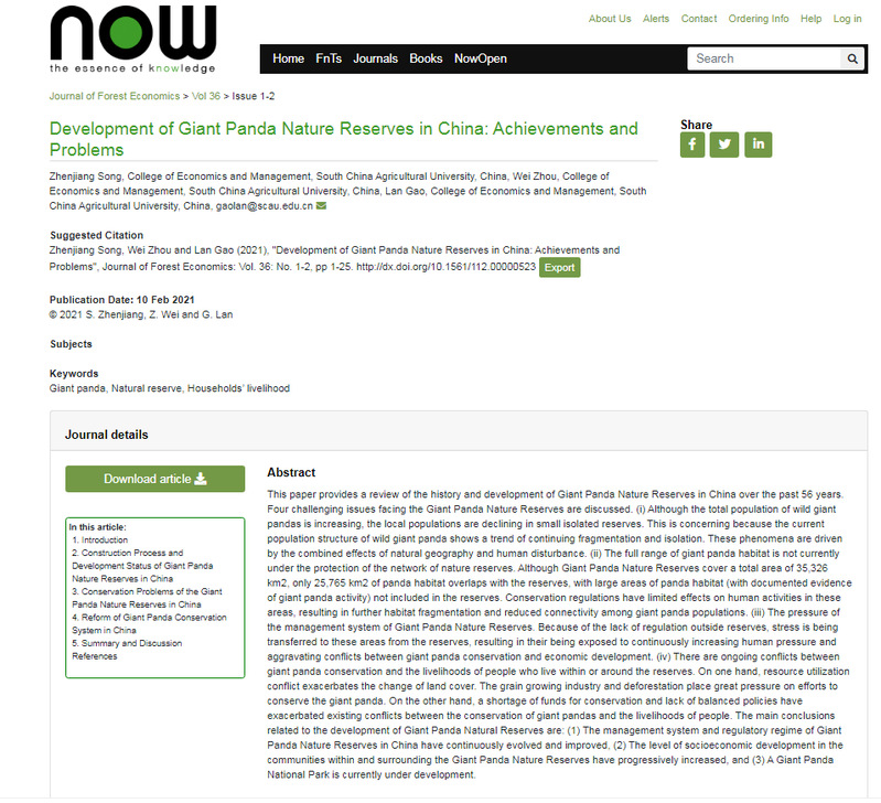 【科研论文推送】《Journal of Forest Economics》宋振江;周伟;高岚:Development of Giant Panda Nature Reserves in China: Achievements and Problems.
