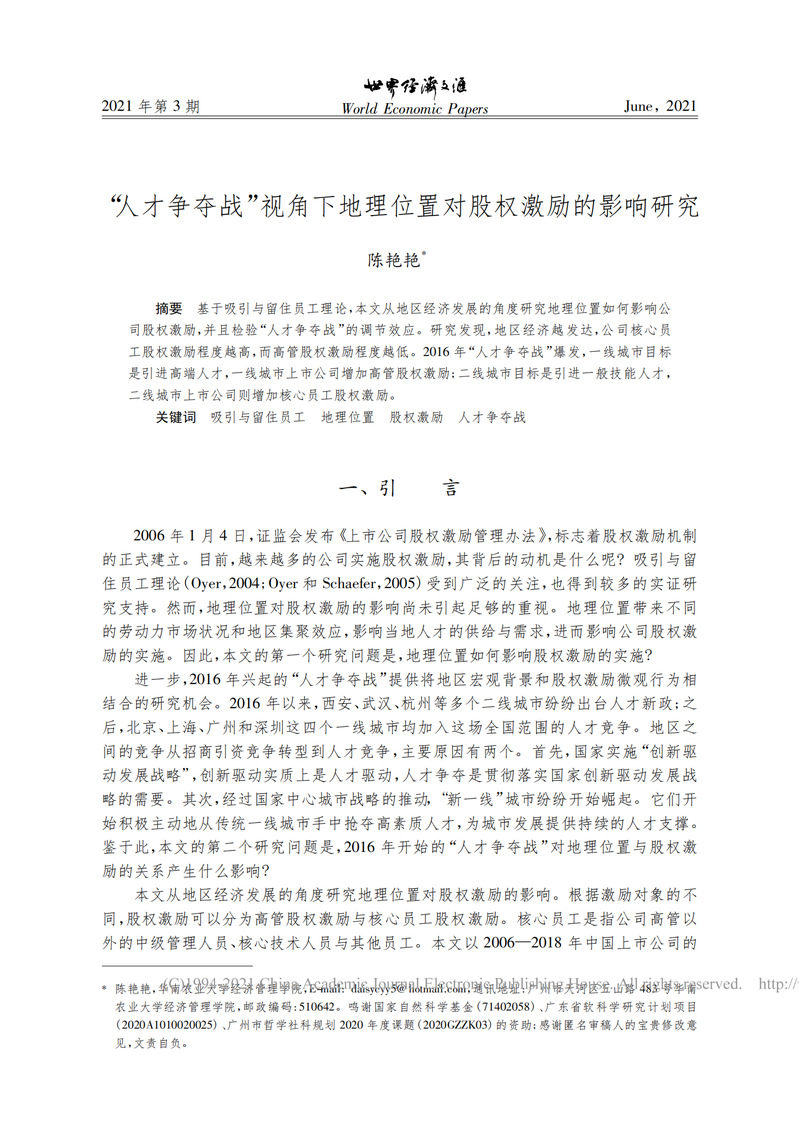 【科研论文推送】《世界经济文汇》陈艳艳:“人才争夺战”视角下地理位置对股权激励的影响研究
