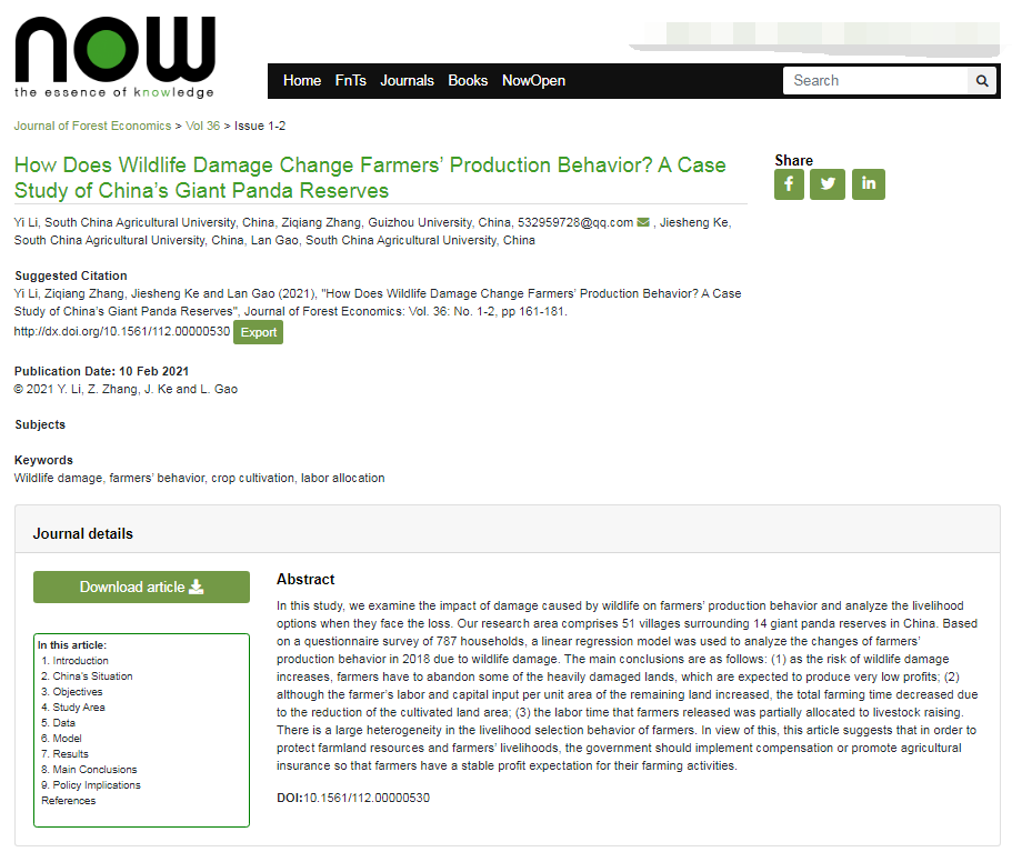 This article is supported by the project The impact of habitat regulation on ecology and livelihoods: taking giant panda reserves as an example from the National Natural Science Foundation of China.