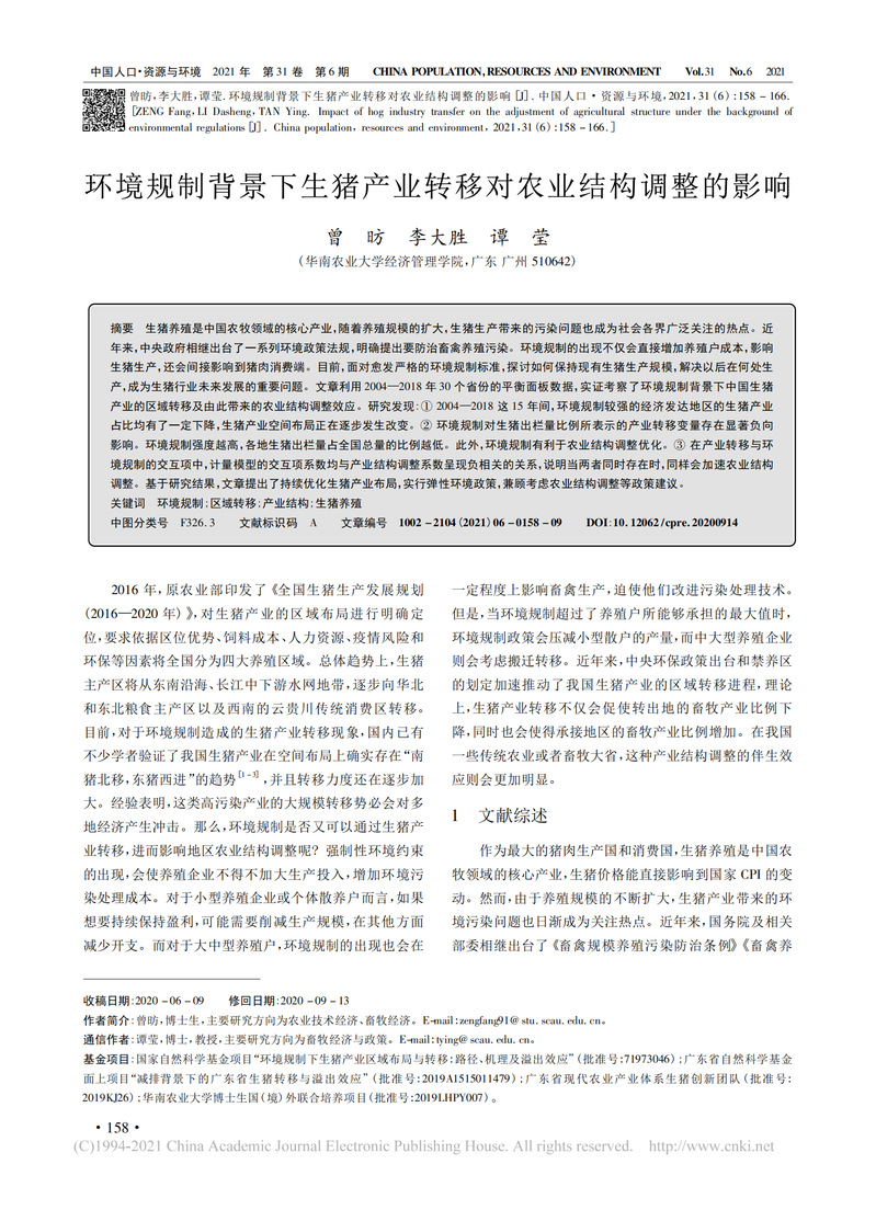 国家自然科学基金项目“环境规制下生猪产业区域布局与转移:路径、机理及溢出效应”(批准号:71973046); 广东省自然科学基金面上项目“减排背景下的广东省生猪转移与溢出效应”(批准号:2019A1515011479); 广东省现代农业产业体系生猪创新团队(批准号:2019KJ26); yl6809永利官网博士生国(境)外联合培养项目(批准号:2019LHPY007).