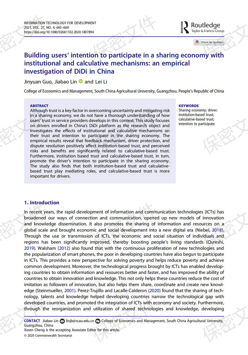 Sharing economy; driver; Institution-based trust; Calculative-based trust; Intention to participate