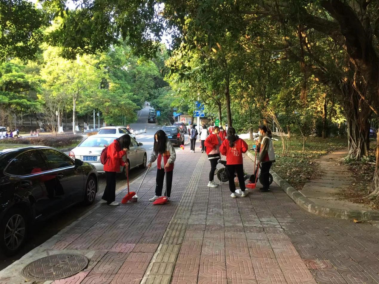 为营造干净卫生的校园环境,近日,我院开展了“我为群众办实事”公共卫生大扫除实践活动。学生志愿者身穿红色志愿服,带着清洁工具,对东区运动场、教四、经管院楼一带的公共区域开展绿化带落叶清扫、街道卫生清洁等工作。