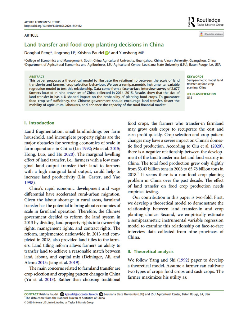 【科研论文推送】《Applied Economics Letters》彭东慧等:Land transfer and food crop planting decisions in China