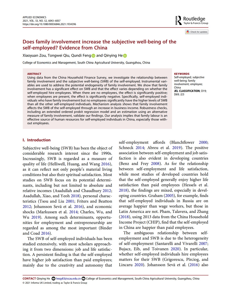 Using data from the China Household Finance Survey, we investigate the relationship between family involvement and the subjective well-being (SWB) of the self-employed. Instrumental variables are used to address the potential endogeneity of family involvement. We show that family involvement has a significant effect on SWB and that the effect varies depending on whether the self-employed hire employees. When there are no employees, the effect is significantly positive; when employees are present, the effect is significantly negative. Specifically, self-employed individuals who have family involvement but no employees significantly have the higher levels of SWB than all the other self-employed indi发布viduals. Mechanism analysis shows that family involvement affects the SWB of the self-employed through an increase in business income. Robustness checks, including an extended ordered probit regression model and an estimation using an alternative measure of family involvement, validate our findings. Our analysis implies that family labour is an effective source of human resources for self-employed individuals in China, especially those without employees.