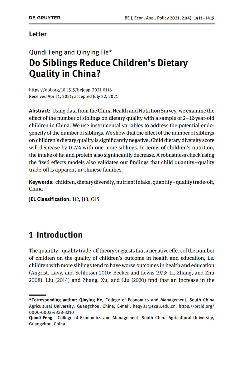 【科研论文推送】《B E Journal of Economic Analysis & Policy》冯群娣、何勤英:Do Siblings Reduce Children’s Dietary Quality in China?