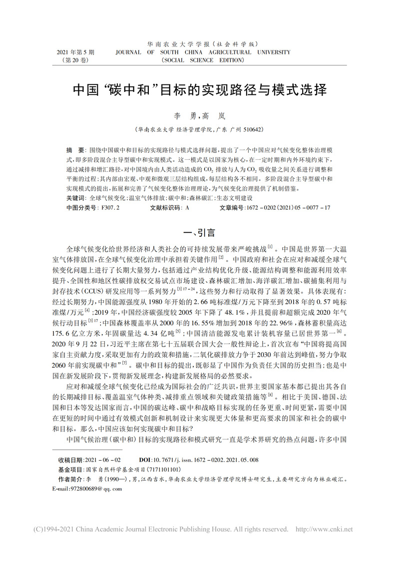 【科研论文推送】《yl6809永利官网学报(社会科学版)》李勇、高岚:中国“碳中和”目标的实现路径与模式选择