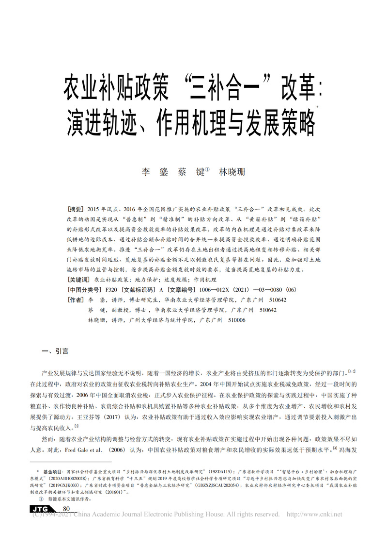 【科研论文推送】《经济体制改革》李鎏等:农业补贴政策“三补合一”改革:演进轨迹、作用机理与发展策略