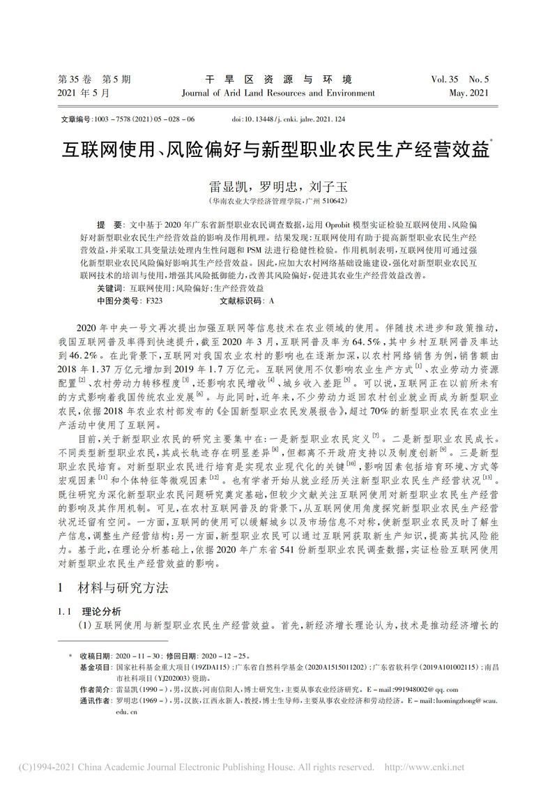 文中基于2020年广东省新型职业农民调查数据,运用Oprobit模型实证检验互联网使用、风险偏好对新型职业农民生产经营效益的影响及作用机理。结果发现:互联网使用有助于提高新型职业农民生产经营效益,并采取工具变量法处理内生性问题和PSM法进行稳健性检验。作用机制表明,互联网使用可通过强化新型职业农民风险偏好影响其生产经营效益。因此,应加大农村网络基础设施建设,强化对新型职业农民互联网技术的培训与使用,增强其风险抵御能力,改善其风险偏好,促进其农业生产经营效益改善。