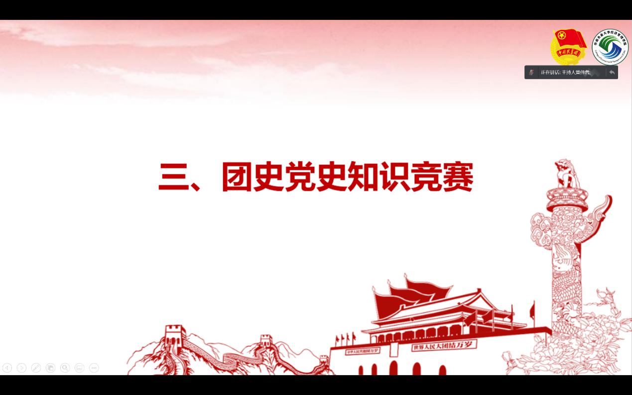 和着春天的节律,脚踏春天的节拍,在2022年我们迎来了中国共产主义青年团成立100周年,与此同时党的二十大也即将到来。为强化新时代高校青年学生爱国主义教育,增强理论学习意识,激发历史使命感与主人翁精神,3月29日晚yl6809永利官网青马班通过腾讯会议的形式开展团史党史知识竞赛活动。