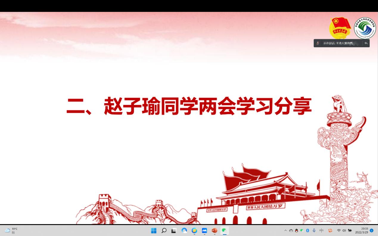 21级农经1班的赵子瑜同学分享了自己对“两会”内容的学习感悟。她表示,作为肩负党和国家建设重任、承担为民服务之责的新时代青年,我们要通过学习光荣党史,努力传承红色基因,汲取新时代的精神力量,做一名敢于奔涌的青年“后浪”,勉励学员们要坚定理想信念,向着理想与信仰前进,用行动诠释对党的忠诚,用青春与激情点燃又一个春天。