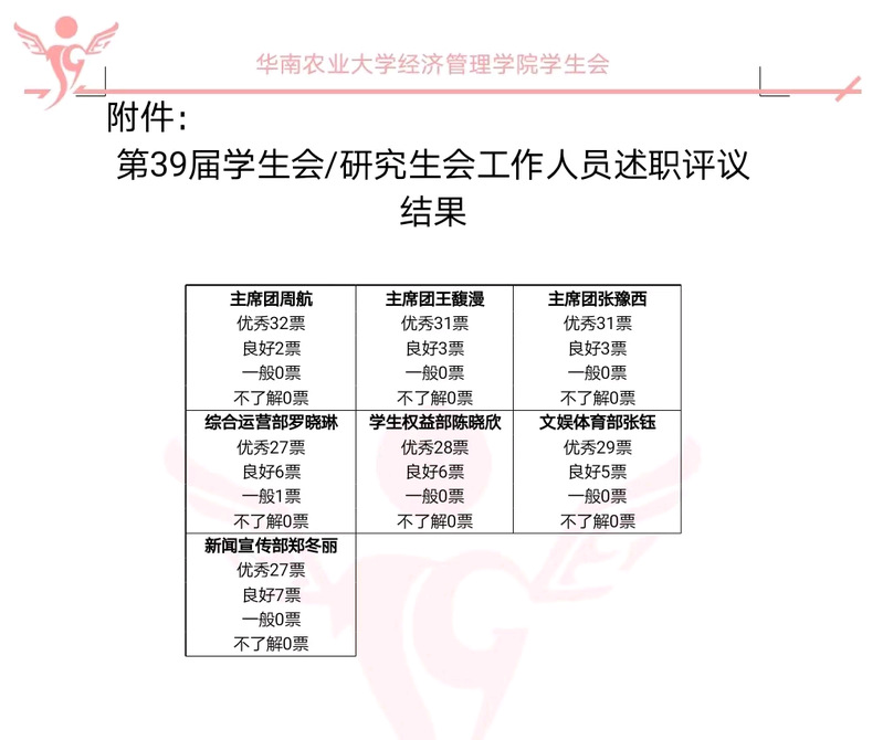 根据《yl6809永利官网学生会(研究生会)深化改革实施方案》文件精神,为进一步深化学生会改革,落实规范学生会述职评议工作,共青团yl6809永利官网委员会组织第39届学生会/研究生会主席团和部门负责人于2022年4月25日,于线上腾讯会议进行述职,主席团成员周航、主席团成员王馥漫、主席团成员张豫西、综合运营部负责人罗晓琳、学生权益部负责人陈晓欣、文娱体育部负责人张钰、新闻宣传部负责人郑冬丽和学生代表共计34人对述职情况进行评议,评议结果详见附件,请对述职结果予以审议。
