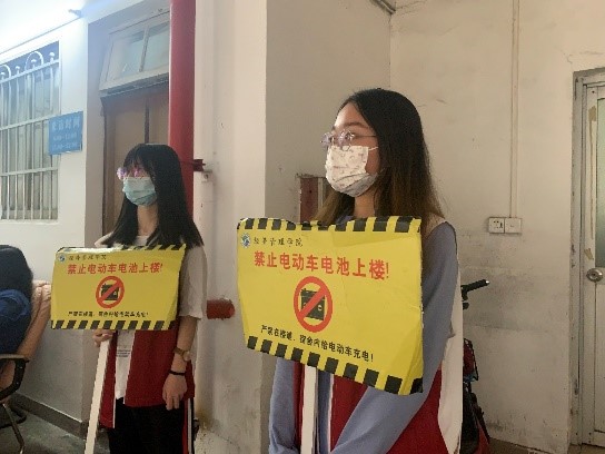 为预防和消除学生宿舍电动车充电安全隐患,加强学生宿舍用电安全意识,经管学院组织志愿者在泰山区宿舍楼栋门口进行安全提示和指引。在每日中午、下午及晚上不同时段,志愿者们手持显眼的提示牌,检查和监督是否存在违规携带电动车电池进入宿舍楼的情况,对进出宿舍楼的学生给予提醒,有力防范学生在宿舍违规用电现象的发生。志愿者们规范站岗、严格监督,为校园社区的安全与秩序、社区文明建设贡献力量,在志愿服务中增强社会责任感,有效保障了宿舍安全和同学们的生命安全。