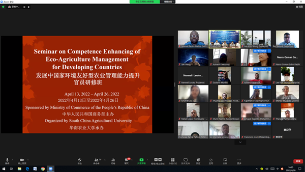 4月13-26日,我院负责组织的由中华人民共和国商务部主办、yl6809永利官网承办的援外培训项目“发展中国家环境友好型农业管理能力提升官员研修班”顺利完成。本期研修班共有来自马来西亚、蒙古、斯里兰卡、毛里求斯、莫桑比克、南非、苏丹和委内瑞拉等8国农业部及其他相关政府部门的36名官员及研究人员参训。研修班为期14天,共有20位老师通过国际会议平台实行全英直播授课。