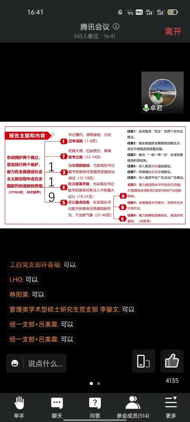 会议围绕“忠诚拥护‘两个确立’,努力强化时代担当”主题展开。尹卓君同志指出,广东省第十三次党代会是以进入全面建设社会主义现代化新征程、豪情满怀迎接党的二十大胜利召开的重要时刻为背景而召开的一次十分重要的会议。她将报告内容分为“五年成就”与“面向未来”两部分,带领大家对省第十三次党代会的主题和内容进行了总结回顾。其中,她将广东省“1+1+9”工作部署凝练成九个关键字——“齐”“破”“沉”、“深”“广”“高”、“新”“农”“人”,即向党中央看齐、找准突破口、将力量和资源向基层下沉,深化改革、扩大开放、抢占改革开放制高点,创新、农业、育人,高度概括了广东省委面临的工作任务,并强调“九个重点任务”与华农学子息息相关。