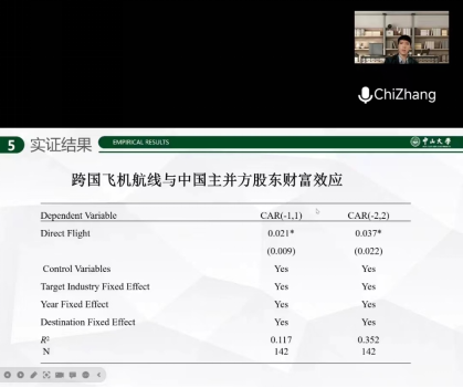 2022年11月18日下午,中山大学国际金融学院张弛助理教授应邀为我院做题为“飞机直航与跨国并购”的学术报告。报告采用腾讯会议的方式进行,副院长黄松教授主持会议,金融系和会计学系部分教师,在校博士研究生和硕士研究生200余人线上参会。