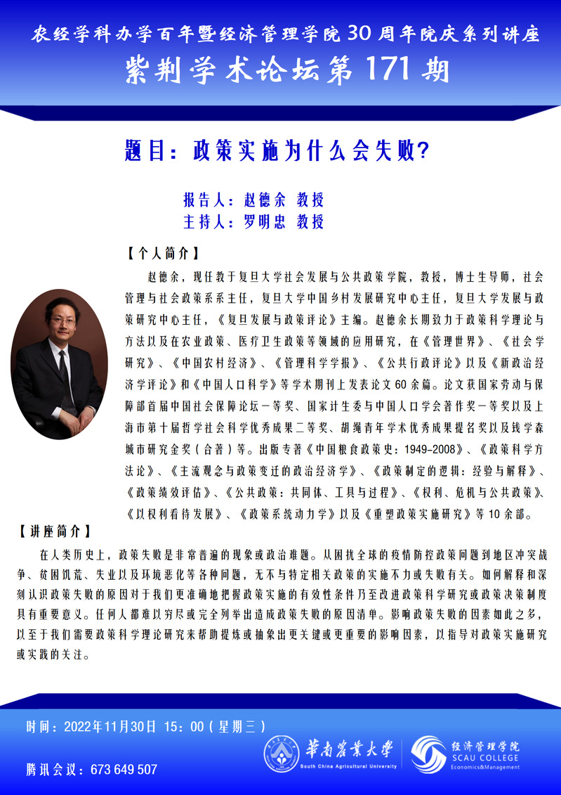 农经学科办学百年暨yl6809永利官网30周年院庆系列讲座:紫荆学术论坛第171期