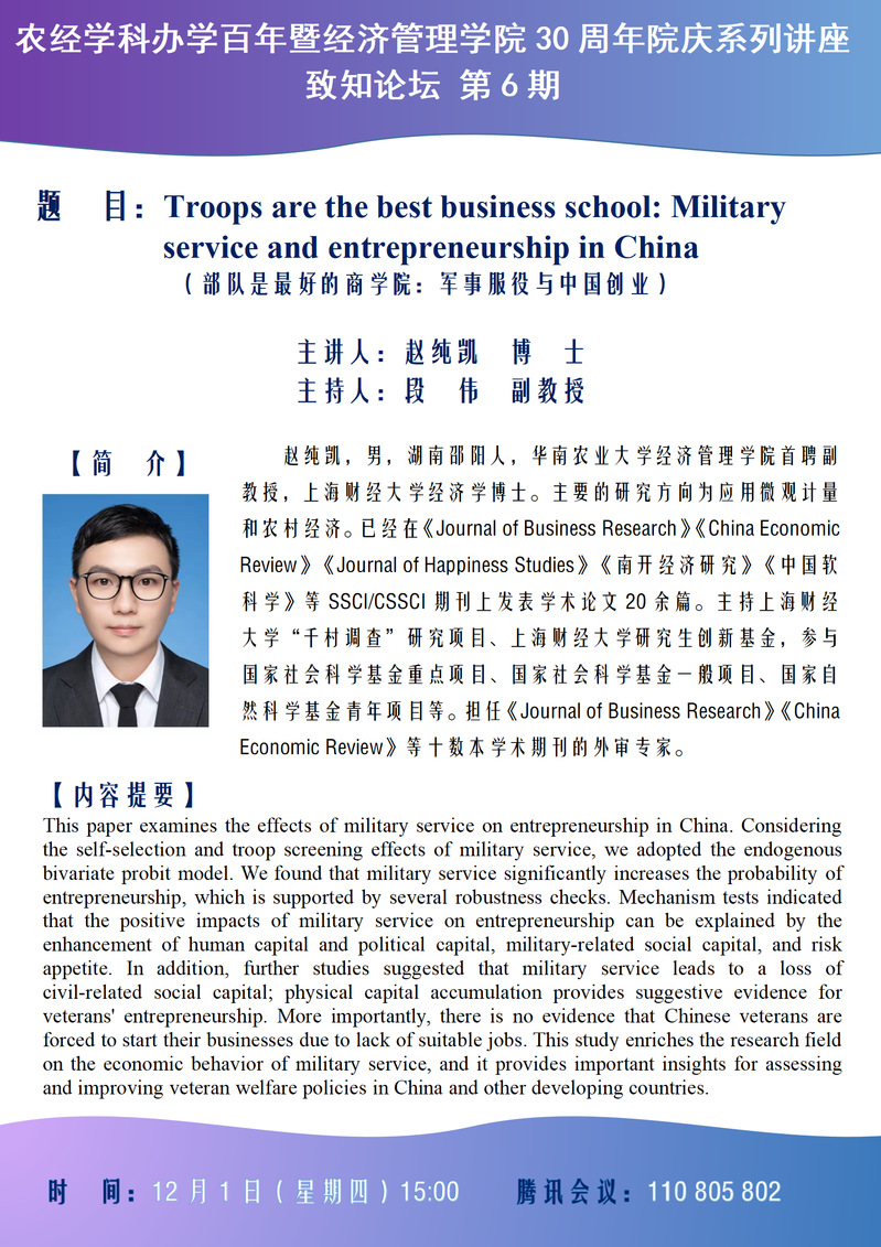 农经学科办学百年暨yl6809永利官网30周年院庆系列讲座:致知论坛第6期