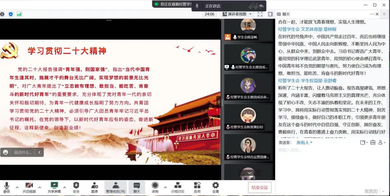 全体成员全神贯注,认真聆听,深入思考。通过本次会议,经管学生会主席团成员陈钰蓉表示,在平时的学习和工作中更好地将思想和行动统一到党的二十大精神上来,以饱满的热情投入到学生工作中,努力建设一个与党同心同行、全心全意为同学服务的学生会。